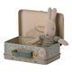 Süsses Mikro Kaninchen in gestreiftem Leinen-Baumwolle Strick-Strampler von Maileg. Dieses süsse Kaninchenbaby ist in drei verschiedenen Strick-Strampler Varianten erhältlich. Es wird in einem Maileg Metallkoffer geliefert.