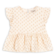 Soft muslin romper "Coco Carta Rosa" made from 100% GOTS-certified organic cotton. Features sweet ruffled sleeves, a mother-of-pearl button placket at the back, and snap fasteners at the crotch for easy dressing and undressing.