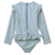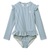 Cute long-sleeved swimsuit "Sille Seersucker Y/D Stripe Peppermint / Creme de la creme" with ruffles by Liewood made of soft seersucker fabric. Comfortable thanks to the stretch content. Made from recycled polyester. The swimsuit has a high UV filter 40+ for the bestsun protection. With zipper on the back.